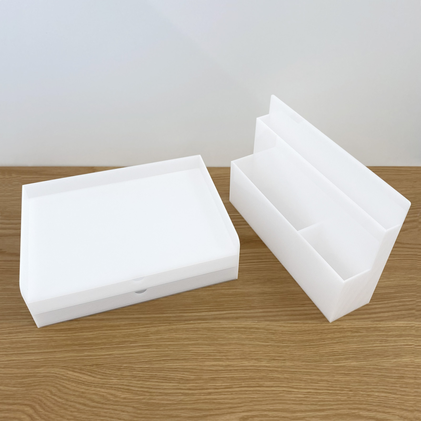 2段の引き出しタイプのベースと、葉書・封筒・その他小物が入れられるタイプのスタンドがセット。
