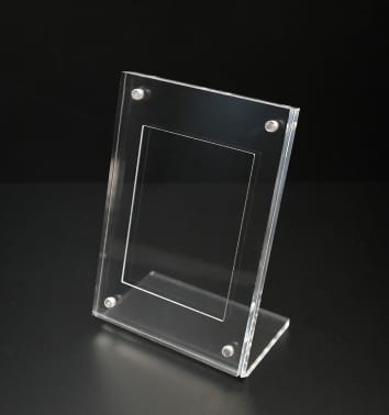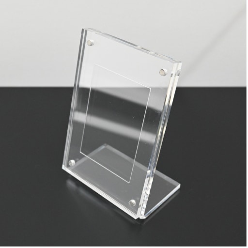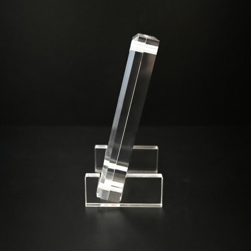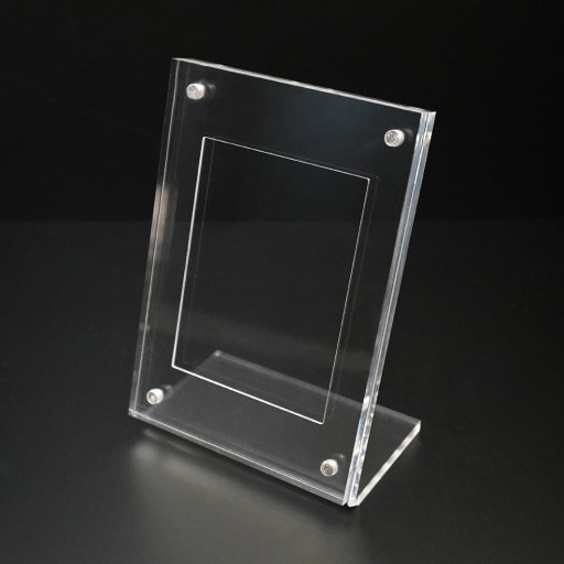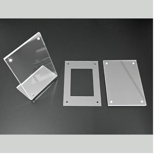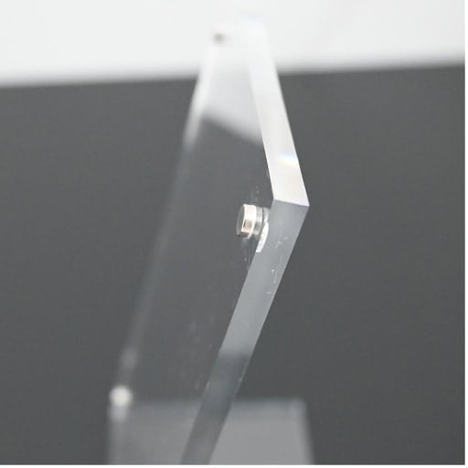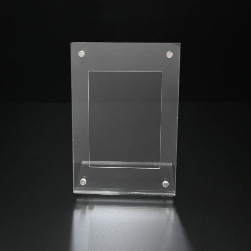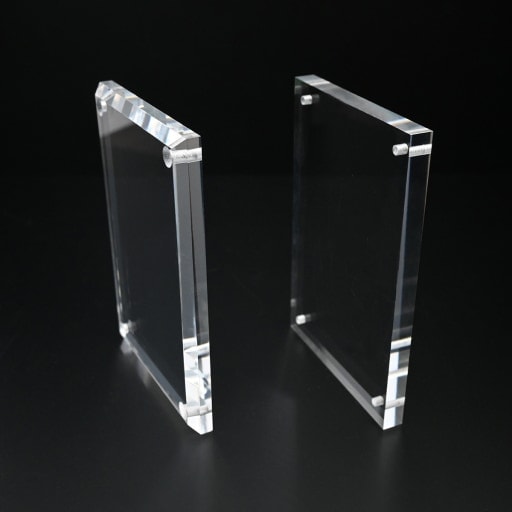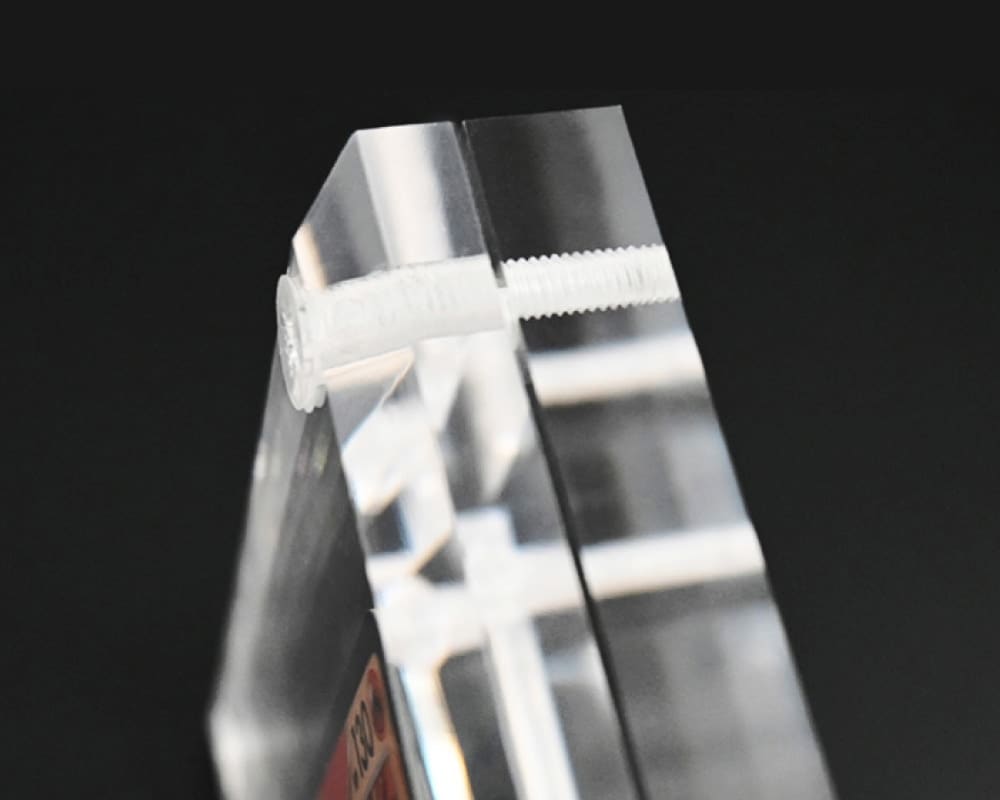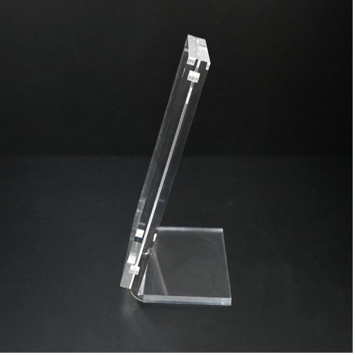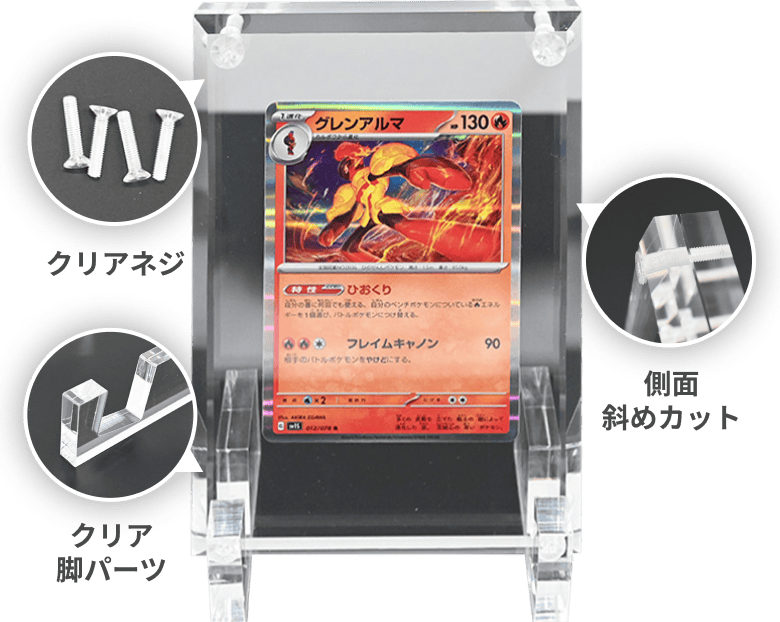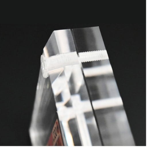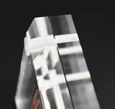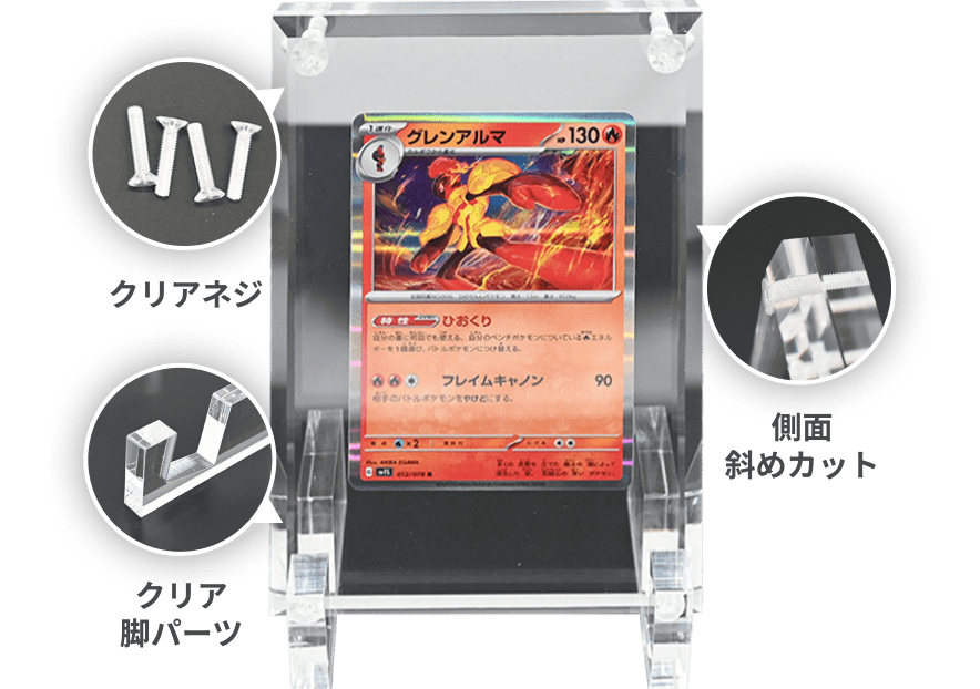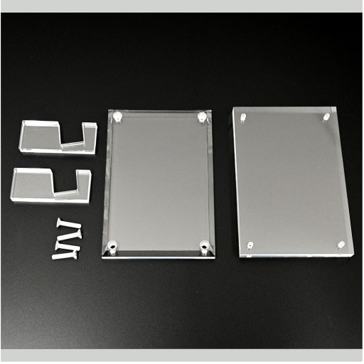 透明感にこだわり、ネジはクリア色のものと厚めの板を使用することで高級感を演出しております。脚パーツも付属しており、斜めに置くことも可能。もちろん単体でも美しく飾れますのでお好みにあわせてご使用できます。